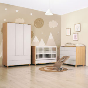 חדר קורי, טיילור ובריידי של המותג דייניז, מעוצב בסגנון צעיר במראה נקי, חמים ואלגנטי. החדר בגוונים בהירים ונקיים בשילוב צבע לבן וצבע עץ אלון, משדר רוגע ויוצר אווירה חמה ומפנקת. החדר כולל: מיטת תינוק דגם קורי ההופכת למיטת מעבר שידה דגם טיילור ארון בגדים דגם בריידי שידת טיילור –בשידה זו שילוב של שני סוגי המגירות, שלוש מגירות רחבות ושלוש מגירות צרות, עם גישה נוחה לכל פריט, לשימוש אופטימלי וניצול מקסימלי. מיטת תינוק קורי ההופכת בקלות למיטת מעבר – מיטת קורי מותאמת לשלבי ההתפתחות והצמיחה של התינוק והופכת למיטת מעבר – פתרון מודולרי שהופך אותה לייחודית ואהובה. בסיס המיטה מתכוונן ל- 2 מצבי גובה: מצב עריסה ומצב מיטת תינוק. המיטה מתאימה לשלבי ההתפתחות של התינוק כבר מגיל לידה, ועונה על הצורך של הורים ליהנות מצמיחתו והתפתחותו של התינוק בחופשיות וללא דאגות. *מגן למיטת מעבר לא כלול במחיר, ניתן לרכוש בנפרד בעלות 249 ₪. *המיטה לא מגיעה עם מזרן / מצעים. התמונה להמחשה בלבד. ארון בגדים בריידי – תוכנן בקווים נקיים, ישרים, חמים ואלגנטיים בעיצוב קלאסי מינימליסטי. לחזית הארון שלוש דלתות בגוון לבן בהיר וצדדיו מחופים מלמין בצבע עץ טבעי, יוצרים קונטרסט, מעניקים תחושת חמימות, ויוצרים אווירה נעימה בחלל, המראה הסופי שמתקבל – ארון גבוה בגימור מתוחכם ומוקפד. מחירון-הובלות-דוורון עוד אלמנט מעניין הוא שילוב שתי מגירות רחבות המאפשרות אחסון נוח, סדר וארגון. הארון עומד על רגליים המרימות אותו מהרצפה ונותנות לו מראה קליל יותר