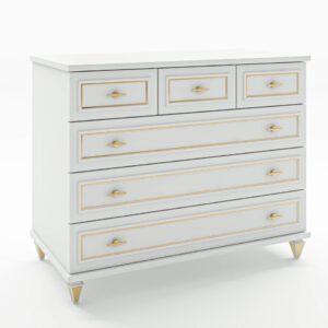 שידה דגם מרלין מגירה ראשונה מחולקת לשלוש ומתחתן שלוש מגירות גדולות נחשבת לחלוקה האופטימלית דפנות מעוצבות בצידי השידה עשויה ממלמין באיכות AA שידה מרלין מושלבת לבן אלון מלמין גלוס AA