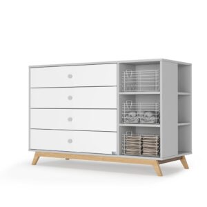 שידת שובל רחבה במיוחד, משלבת אחסון פתוח וסגור על מנת לאפשר שימוש בשידה לאורך שנים. צבע גוף: לבן + אפור + טבעי חומר: MDF מלא איכותי וחזק (כולל פנים המגירות) גימור: אולטרא גלוס, רגלי עץ מעוצבות, השידה מגיעה עם סלסלות וחלוקה פנימית מובנית במגירה העליונה עומק מגירות: 50 ס”מ יציבות מלאה: מוט פלדה מחושלת לחיזוק מבנה השידה לטווח ארוך. תאור : השידה מתאימה לאחסון מסודר של בגדי וחפצי התינוק לאורך זמן, הודות לגודל המגירות * יש להקפיד לרכוש את מוצרינו אצל המשווקים המורשים. תעודת-ארחיות_סגל שירות משלוחים – קבוצת סגל